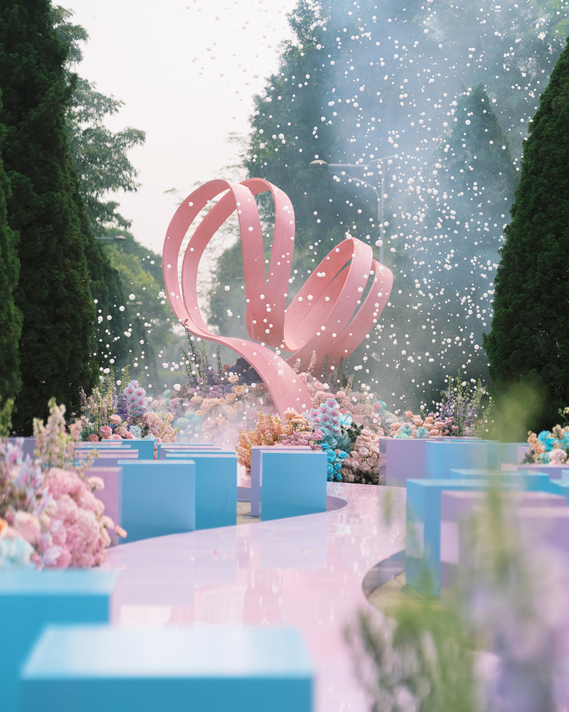 Roselle Reverie embodies traditional beauty reinterpreted through a refined contemporary lens. With blush pink as the dominant palette, the concept unveils a soft, graceful setting where floral arrangements feel airy and organic while remaining thoughtfully composed. The Double Happiness symbol blends seamlessly into the overall design, telling a story of connection and an auspicious beginning.