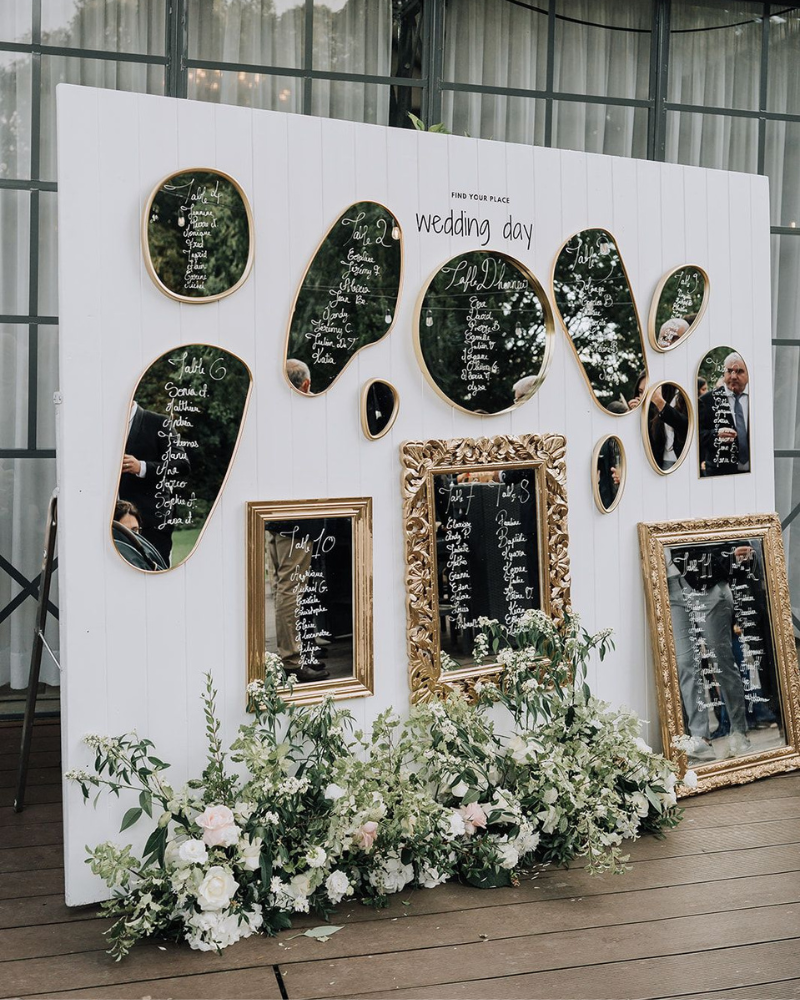 If you are looking for a wedding seating chart with a classic touch, display your guest list on gold framed mirrors. The intricate metallic borders bring a vintage elegance to your reception space. For a garden inspired look, consider hanging antique mirrors with handwritten calligraphy.
