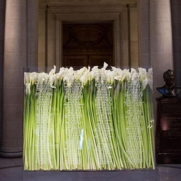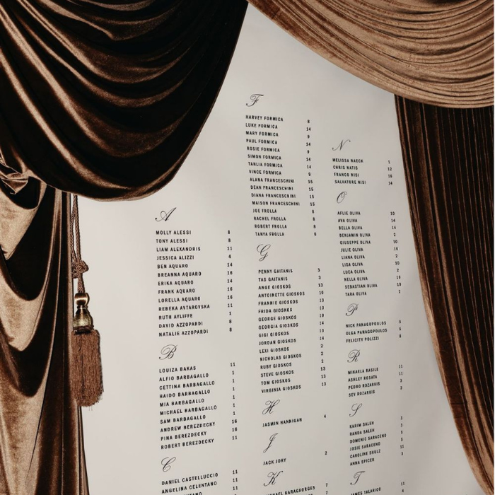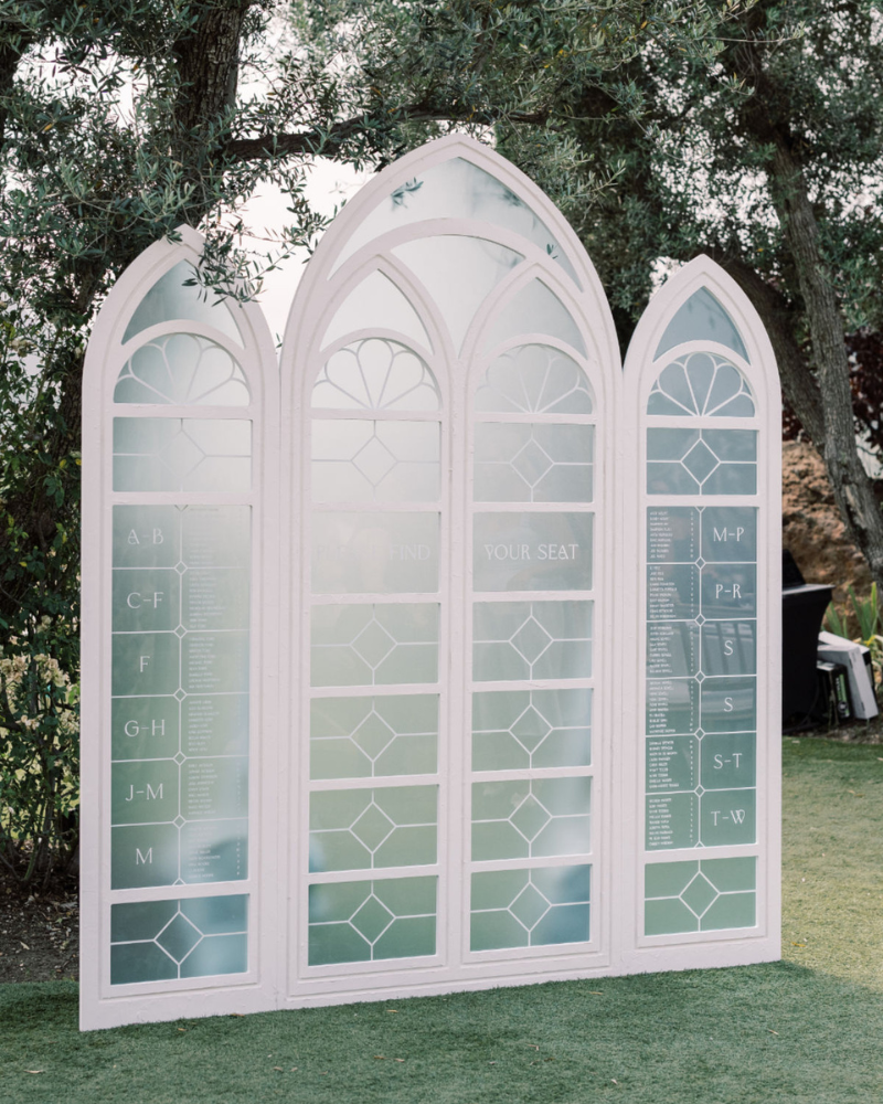 Architectural elements offer incredible inspiration for any seating chart. NFL star Penei Sewell used an arched structure reminiscent of elegant window frames, a detail often seen in Malibu inspired wedding designs. Guest names were printed on its reflective panels for a modern yet timeless effect.