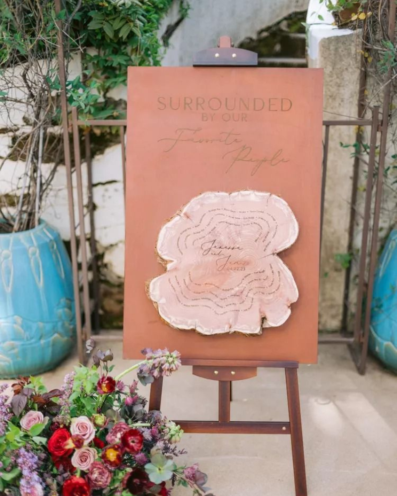 Make a striking impression with an unexpected material such as natural cedar wood slices. This idea works beautifully for nature inspired weddings, especially those with an intimate guest count and an appropriate setting. Each cedar slice is engraved with a guest’s name and mounted on a leather panel, adding depth and personality to the overall wedding design.
