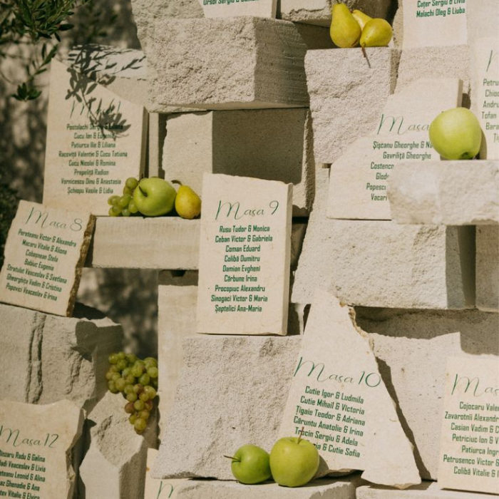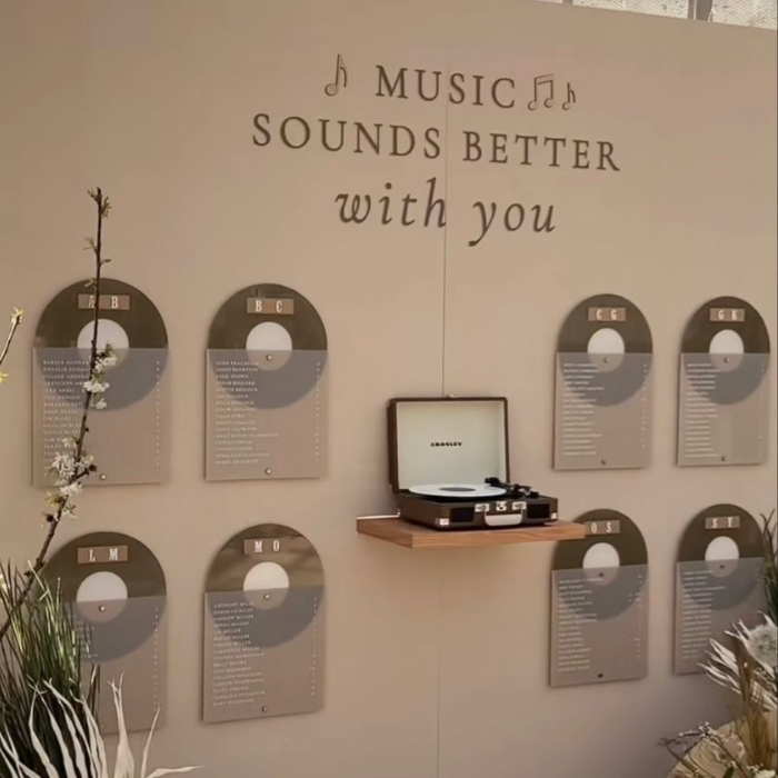 If there is a shared interest or passion that defines your relationship, incorporate it into your seating chart to create a personal emotional touch. At country music star Cole Swindell’s wedding, the couple referenced their beginnings on a music video set by using oversized guitar picks for guest names and placing a guitar at the center of the display. The concept added sentiment and storytelling to the design.