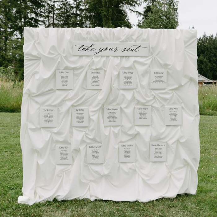 If you are planning a modern themed wedding, such as this elegant Napa Valley celebration, an all white seating board is a perfect fit. You can print guest names directly on the surface or attach rectangular acrylic or paper cards to the backdrop. Add candles or overhead lighting to create warmth and highlight the display.