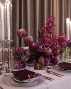 Tím mận là lựa chọn dành cho những ai yêu sự sâu lắng. Gam màu này vừa có chút huyền bí, vừa đủ lãng mạn để khiến mọi chi tiết trở nên cuốn hút. Khi phối cùng chất liệu nhung, vải buông hoặc hoa tối màu, nó mang lại chiều sâu cho không gian, thích hợp cho cả phong cách cổ điển lẫn hiện đại.