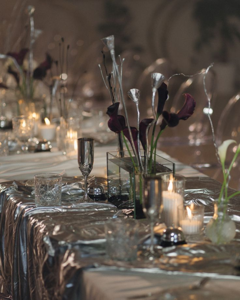 Bạc luôn mang đến cảm giác sang trọng và cảm giác tương lai. Chỉ cần một vài chi tiết nhỏ ánh bạc như chân nến, ly thủy tinh mạ kim hay bó hoa điểm nhũ, toàn bộ không gian đã trở nên sáng bừng và đầy thu hút. Màu bạc dễ kết hợp với hầu hết các tông màu khác, tạo nên hiệu ứng lấp lánh nhẹ nhàng mà vẫn giữ được vẻ thanh lịch của mùa đông.